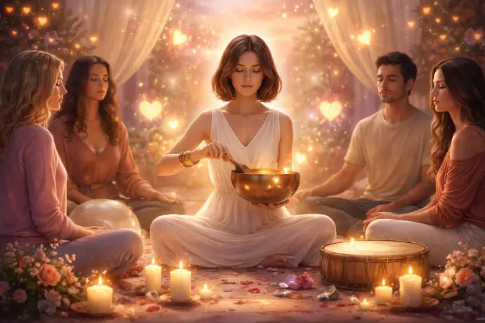 accompagné de vibrations sonores avec bols tibétains, tambours...